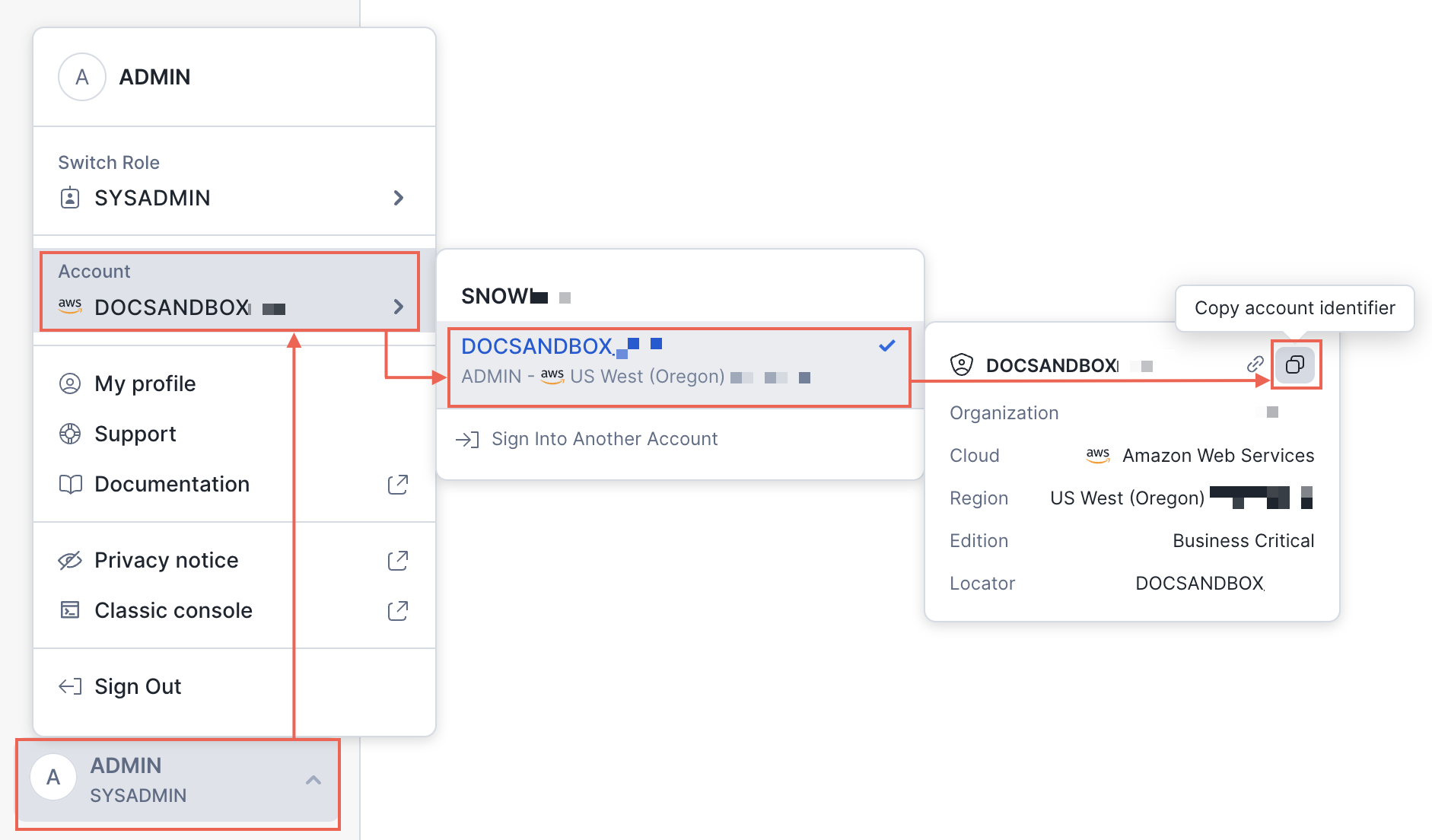 - Account identifier does not support the Legacy account locator in a region format. Use Snowflake preferred name in organization format.